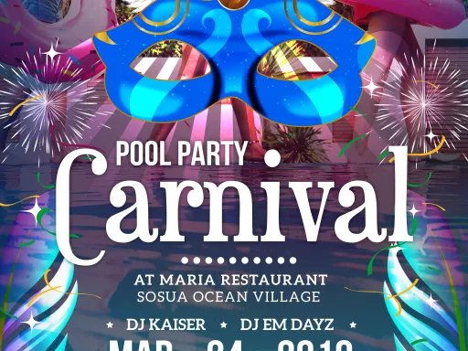 We invite you to have fun at our pool party at Restaurant Maria next Sunday, March 24 with DJs from Venezuela and Dominican Republic. Entrance is free. The party starts at 1 pm, so enjoy our infinity pool, delicious cocktails and the atmposphere of the carnival. For more info call 829-961-4455.