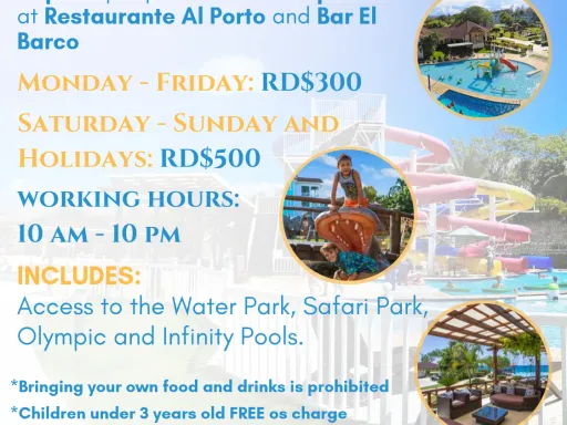 At the entrance you will pay a deposit of RD$300 per person (weekdays) and RD$500 per person (weekends and holidays). This deposit will be applied toward your bill at the Restaurant Al Porto o Bar El Barco.