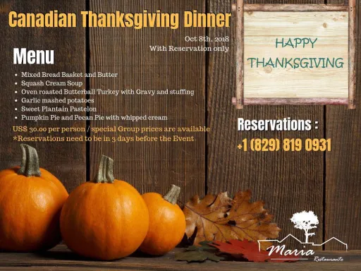 Celebre el Día de Acción de Gracias Canadiense este mes en Restaurante María con menu especial preparado para Usted, su famlia y amigos. Contáctenos a 829-819-0931 para reservas.