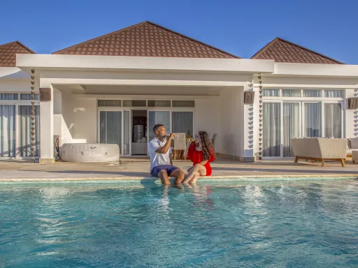 - Villas frente al mar de 3 y 4 dormitorios con piscina privada y villas de 3 dormitorios con vista parcial al mar en la segunda línea de propiedades de Ocean Village Deluxe.