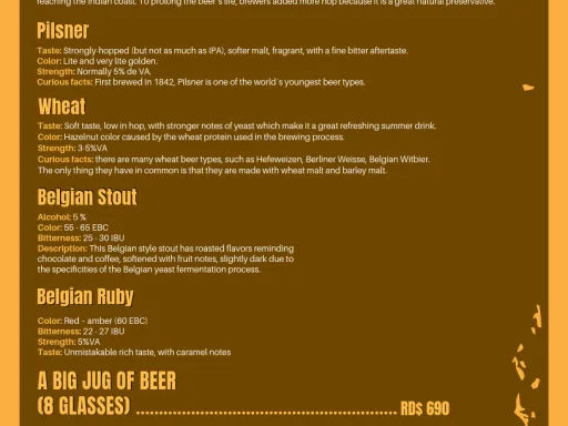 Craft brewery SOV brews five types of 100% natural beer - popular Pilsner, famous IPA, original Wheat, thick Belgian Stout and sophisticated Belgian Ruby. More details on each of them in our new beer menu at the restaurant Laguna SOV.